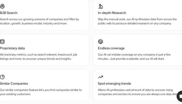 Growth metrics, industry trends, and competitive analysis are now at your fingertips, granting you the foresight to spot and act on emerging trends. With Altero AI, initiate detailed company coverage in moments, transforming the way you identify and engage with similar companies and prospective clients.