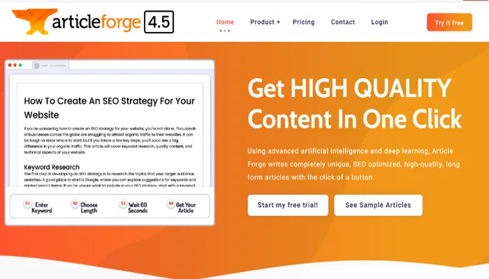 The platform is tailored for individuals, businesses, and content creators seeking high-quality, SEO-optimized, and unique articles at the click of a button. Whether you're looking to enhance your website, boost SEO rankings, or save time and money, Article Forge has you covered.