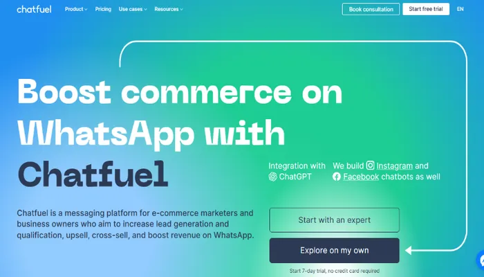 Chatfuel isn't just a platform; it's your e-commerce partner transforming how you connect with customers via WhatsApp. It's all about deepening those client relationships through clever, AI-powered chats that feel personal and timely.