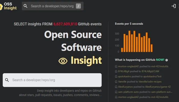 OSS Insight serves as your AI-assisted lens into the GitHub universe, providing a sophisticated platform to analyze and visualize GitHub event data. With the innovative Chat2Query feature embedded in TiDB Cloud, OSS Insight simplifies the complex data landscape of GitHub, making it accessible for tech enthusiasts, researchers, and developers alike.