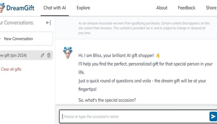 Gift shopping can be tricky, especially when you want something personal and meaningful. DreamGift aims to make the process easier by using an AI-powered assistant called Bliss to help you find tailored gift options. Instead of browsing endlessly, Bliss engages with you, asking questions about the recipient and occasion to come up with personalized gift suggestions. The platform also pulls in real-time data from Amazon, giving you up-to-date prices and availability.