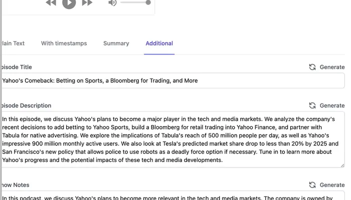 Audio Transcription: Streamline the audio transcription process. Whether you're a busy podcaster or need to transcribe any audio content, the AI-powered transcription service quickly and accurately converts audio into text. It even generates episode titles, descriptions, and show notes to help you promote your podcast effectively.