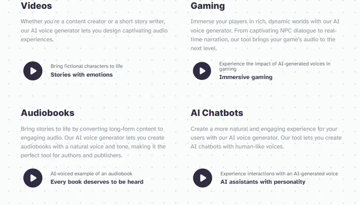 Whether you're producing audiobooks, enriching gaming experiences, or transforming written content into engaging audio, this AI voice generator is your ultimate solution. With advanced Generative AI technology, you can even clone your own voice, bringing a personal touch to your creations.