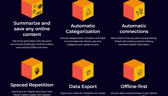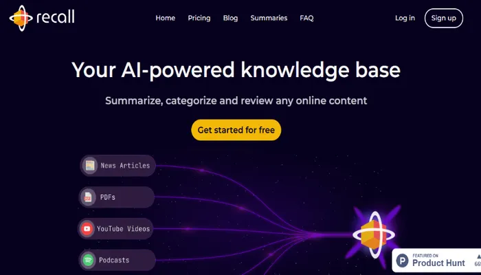 Recall is your ultimate AI-powered knowledge base, revolutionizing the way you manage online content. In today's fast-paced digital landscape, staying on top of information is essential. The process is simplified by enabling you to effortlessly summarize, categorize, and review online content of all types, including blog posts, YouTube videos, articles, PDFs, and more.