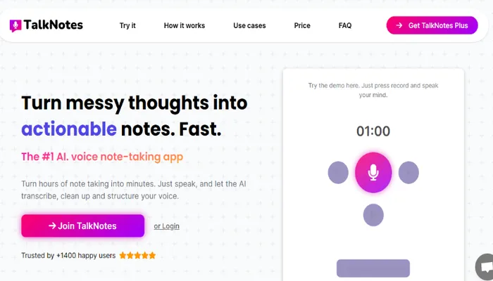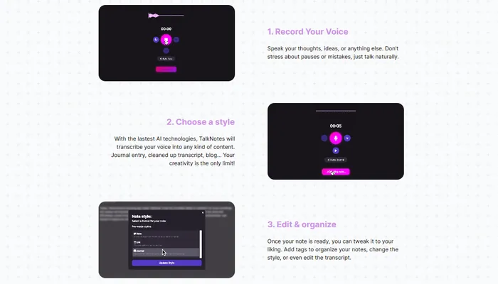 What sets TalkNotes apart is its versatility. Need to draft a blog post? Simply speak it out, and the AI will convert your speech into a well-structured article. Want to capture the minutes of a meeting? Just hit record and talk naturally; you'll have a detailed and organized transcript at your fingertips in no time. The application is so intuitive that you don't have to worry about the layout, format, or even minor mistakes in your speech.