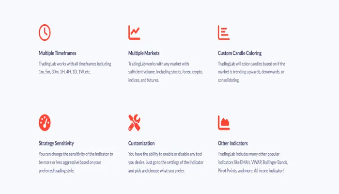 TradingLab is designed to be user-friendly, compatible with multiple timeframes (including 1m, 5m, 30m, 1H, 4H, 1D, 1W, etc.), and adaptable to various markets such as stocks, forex, crypto, indices, and futures. Additionally, the indicator provides custom candle coloring to visually represent market trends.